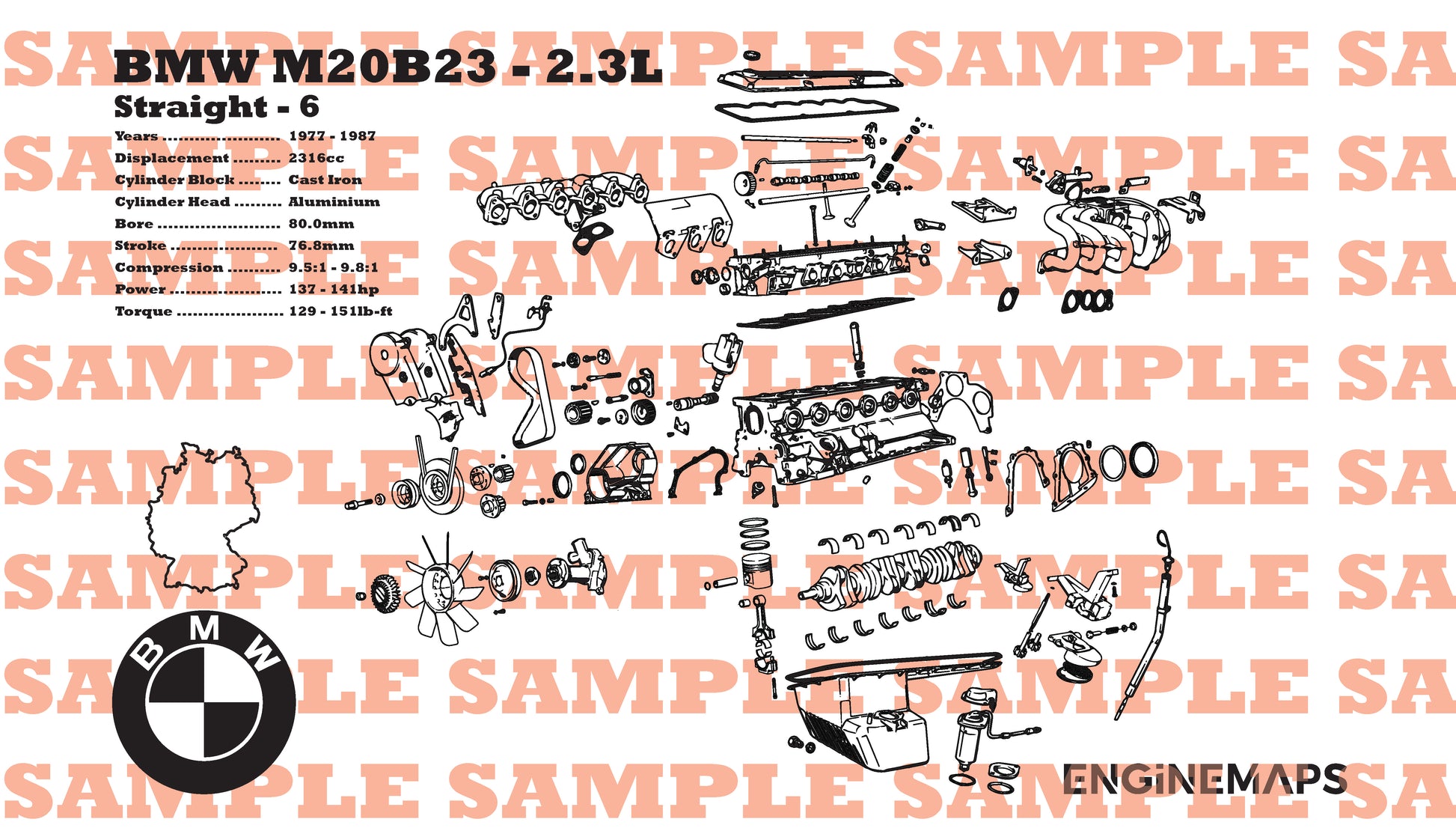 Exploded view banner of BMW's Iconic M20B23 Engine. Made with durable external grade vinyl with reinforced hems. 3 sizes available, perfect for everything from wall decor to hanging in the shed / garage / workshop. Strong Eyelets come standard.