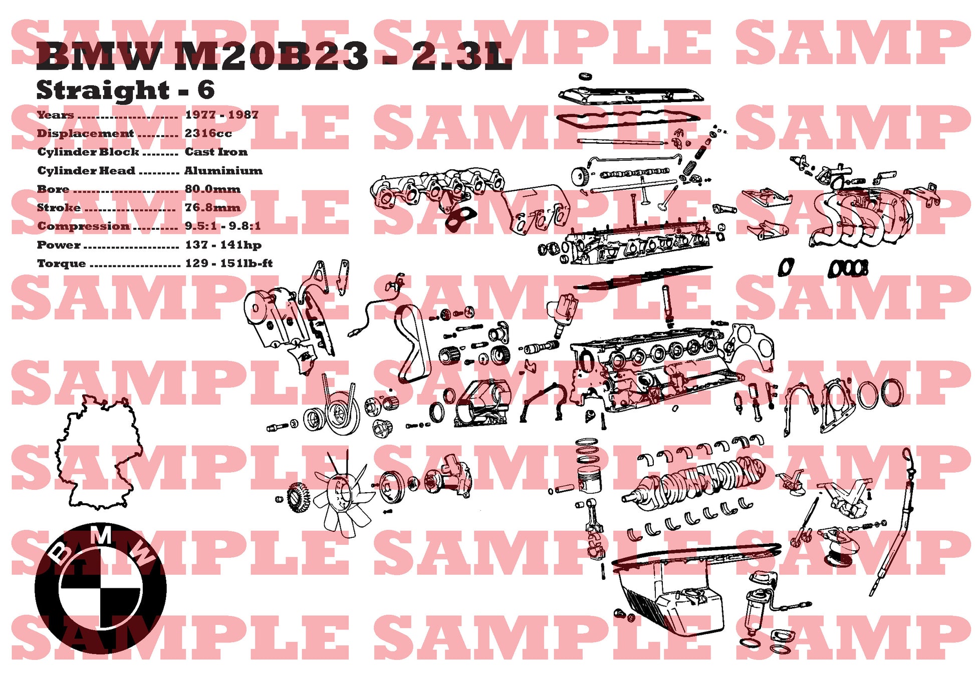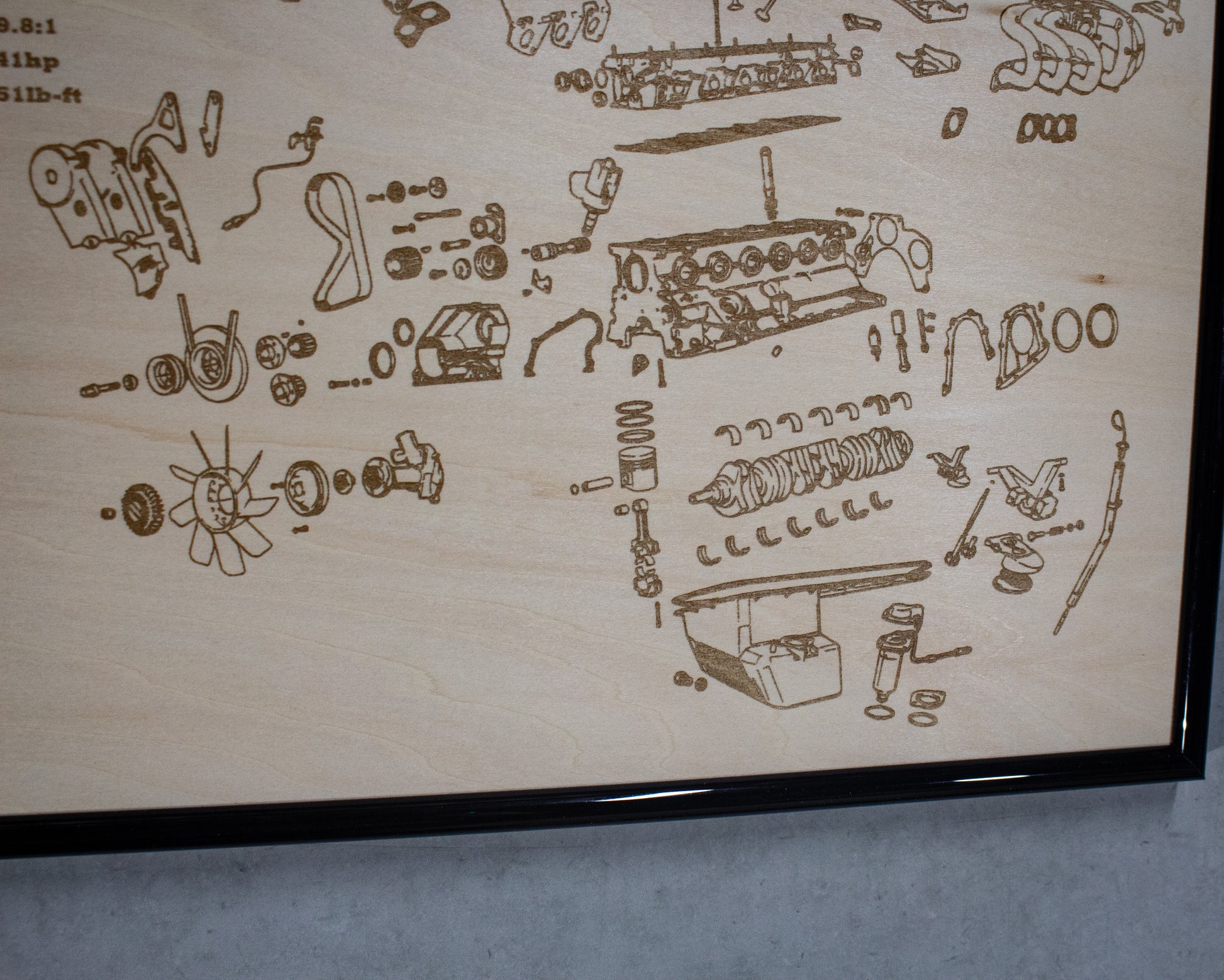 Laser engraved exploded view of BMW's Iconic M20B23 Engine. Wrapped in a sturdy frame with solid mounting points. Each poster is hand made and laser engraved right here in Adelaide.