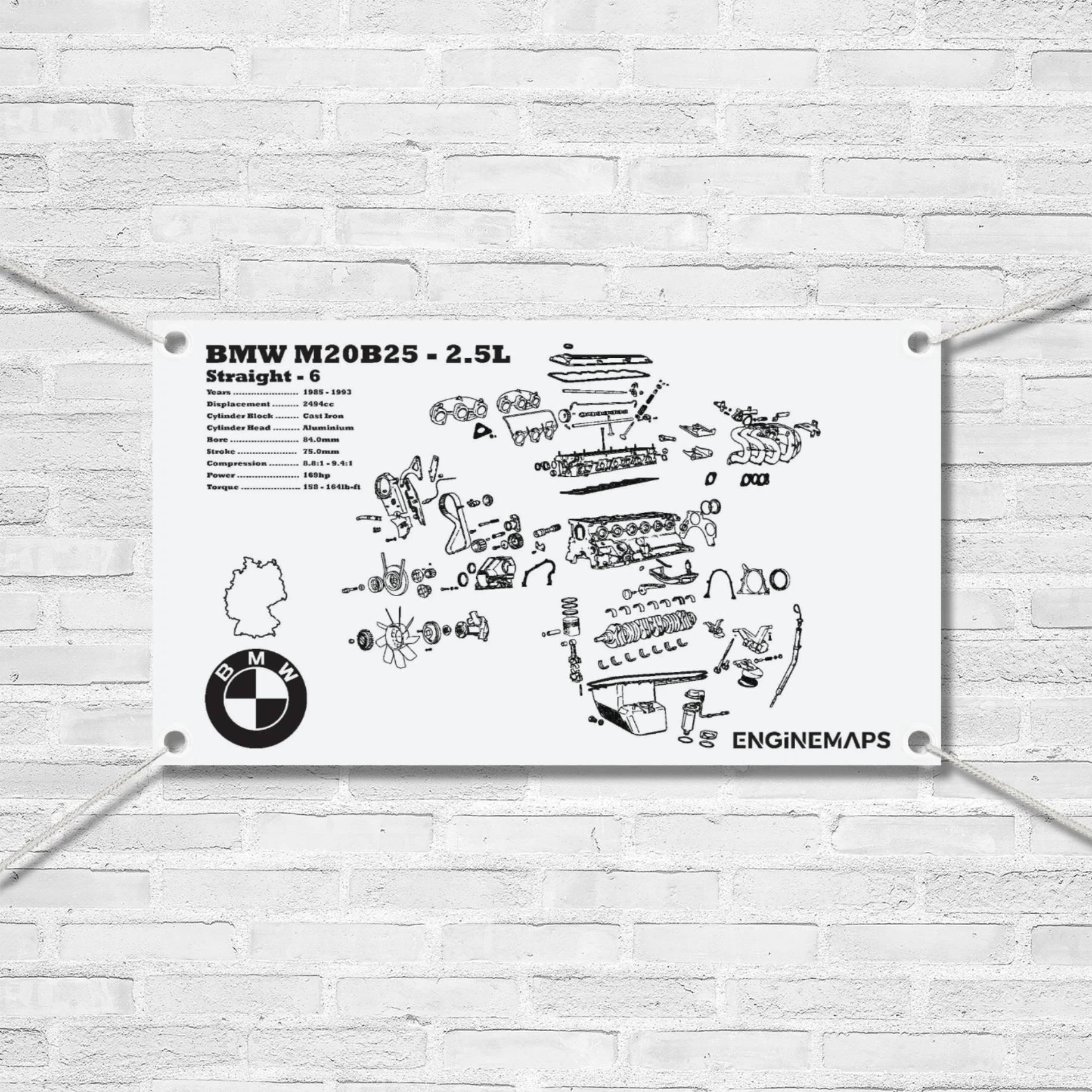 Exploded view banner of BMW's Iconic M20B25 Engine. Made with durable external grade vinyl with reinforced hems. 3 sizes available, perfect for everything from wall decor to hanging in the shed / garage / workshop. Strong Eyelets come standard.