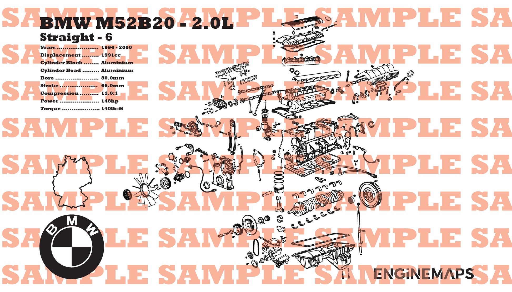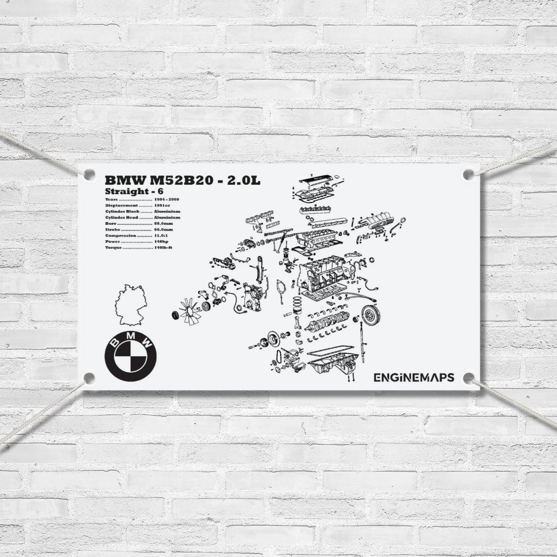 Exploded view banner of BMW's Iconic M52B20 Engine. Made with durable external grade vinyl with reinforced hems. 3 sizes available, perfect for everything from wall decor to hanging in the shed / garage / workshop. Strong Eyelets come standard.
