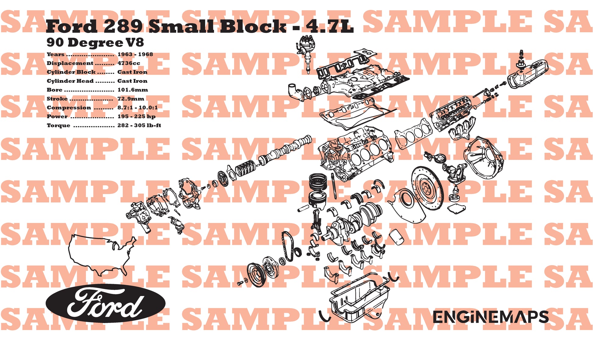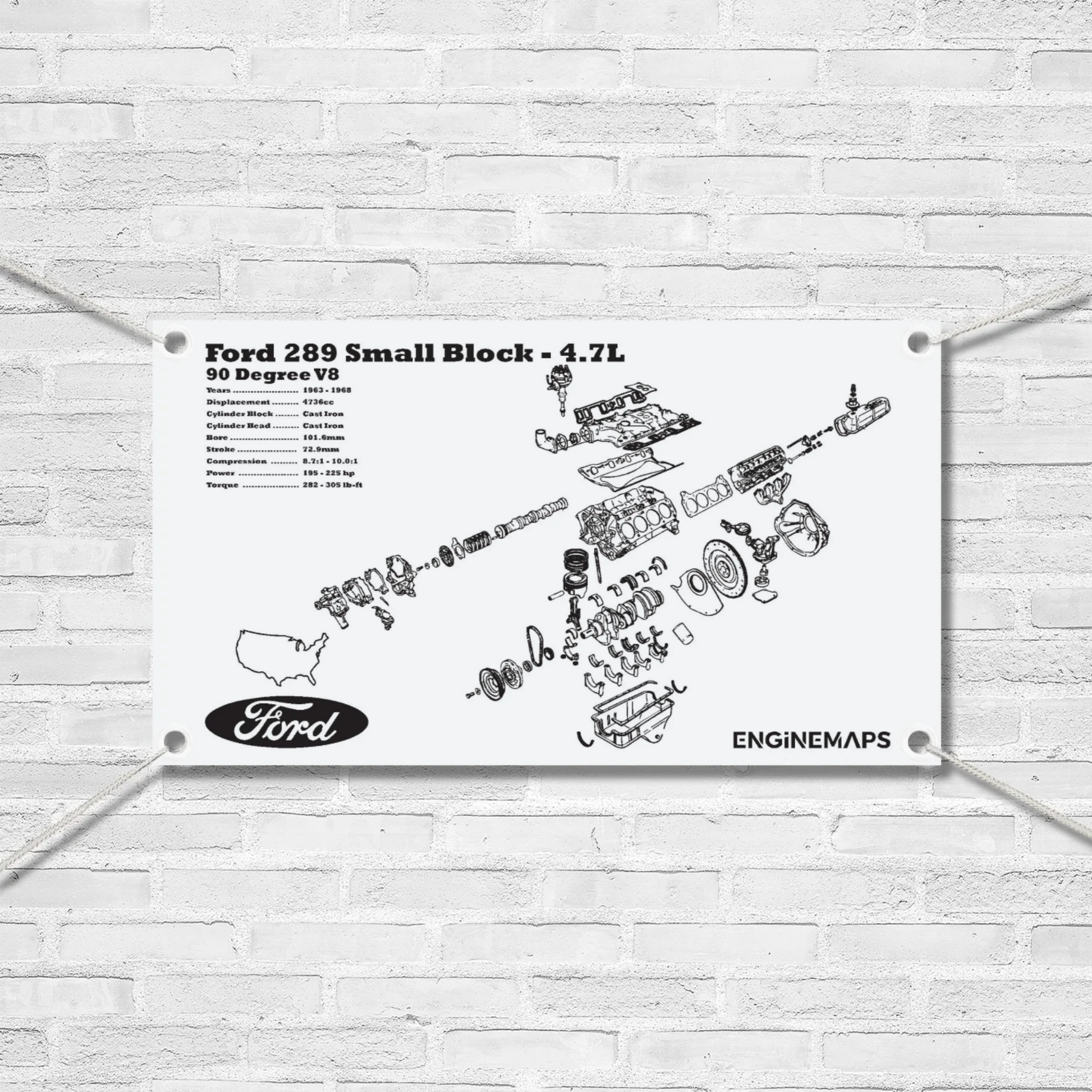 Exploded view banner of Ford's Iconic 289 small block V8 Engine. Made with durable external grade vinyl with reinforced hems. 3 sizes available, perfect for everything from wall decor to hanging in the shed / garage / workshop. Strong Eyelets come standard.