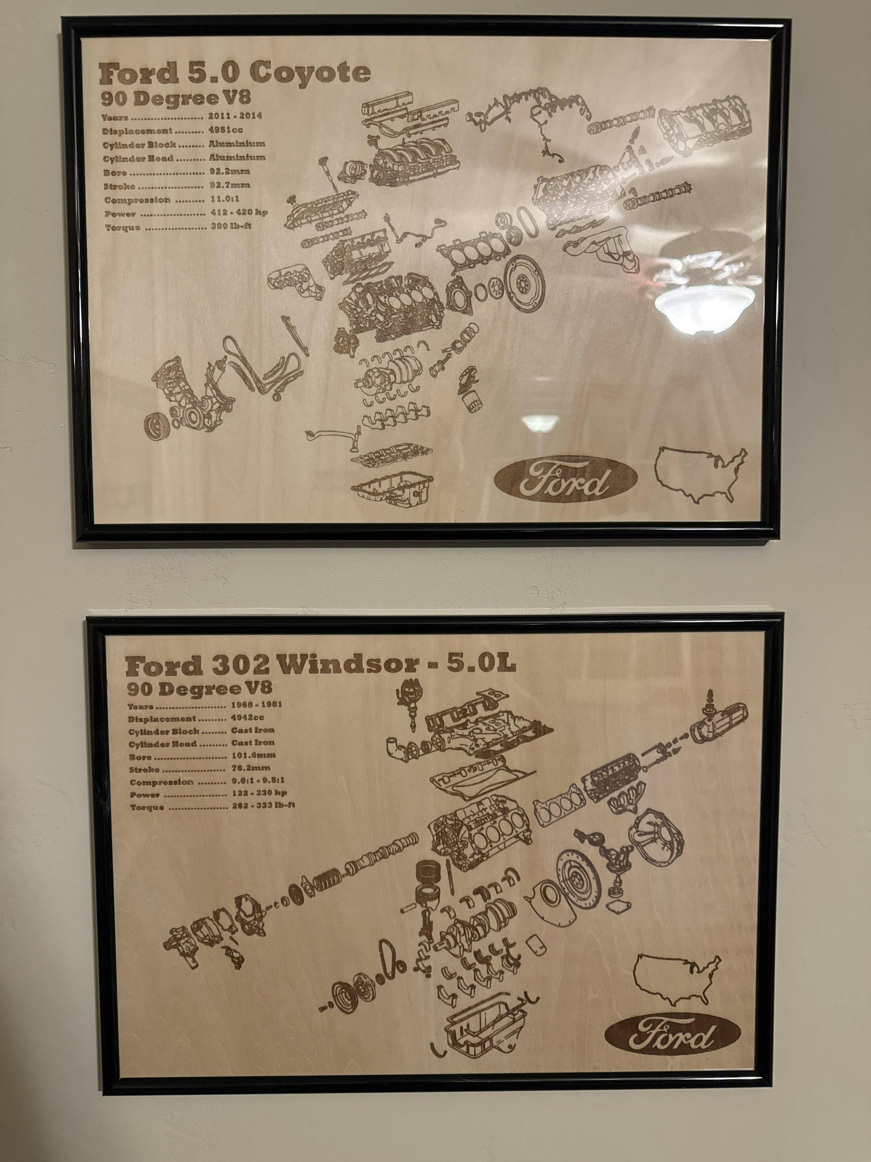 Laser engraved exploded view of Ford's Iconic Windsor 302 V8 Engine. Wrapped in a sturdy frame with solid mounting points. Each poster is hand made and laser engraved right here in Adelaide.
