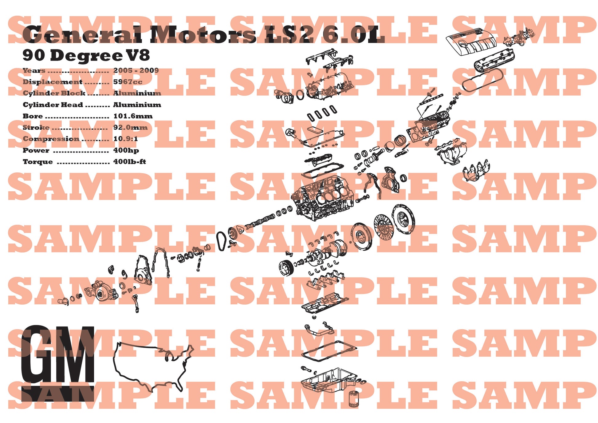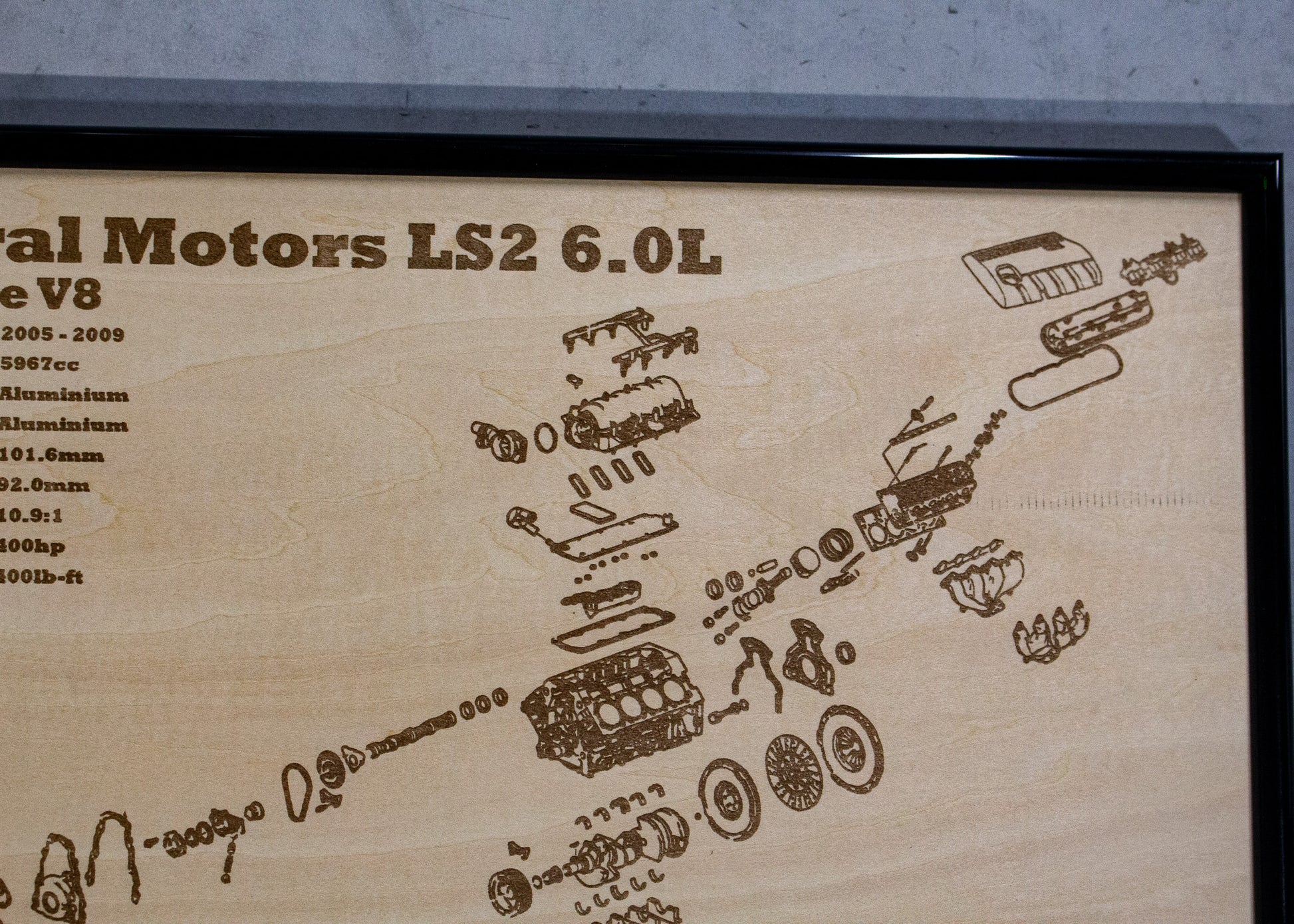Laser engraved exploded view of General Motor's Iconic LS2 V8 Engine. Wrapped in a sturdy frame with solid mounting points. Each poster is hand made and laser engraved right here in Adelaide.