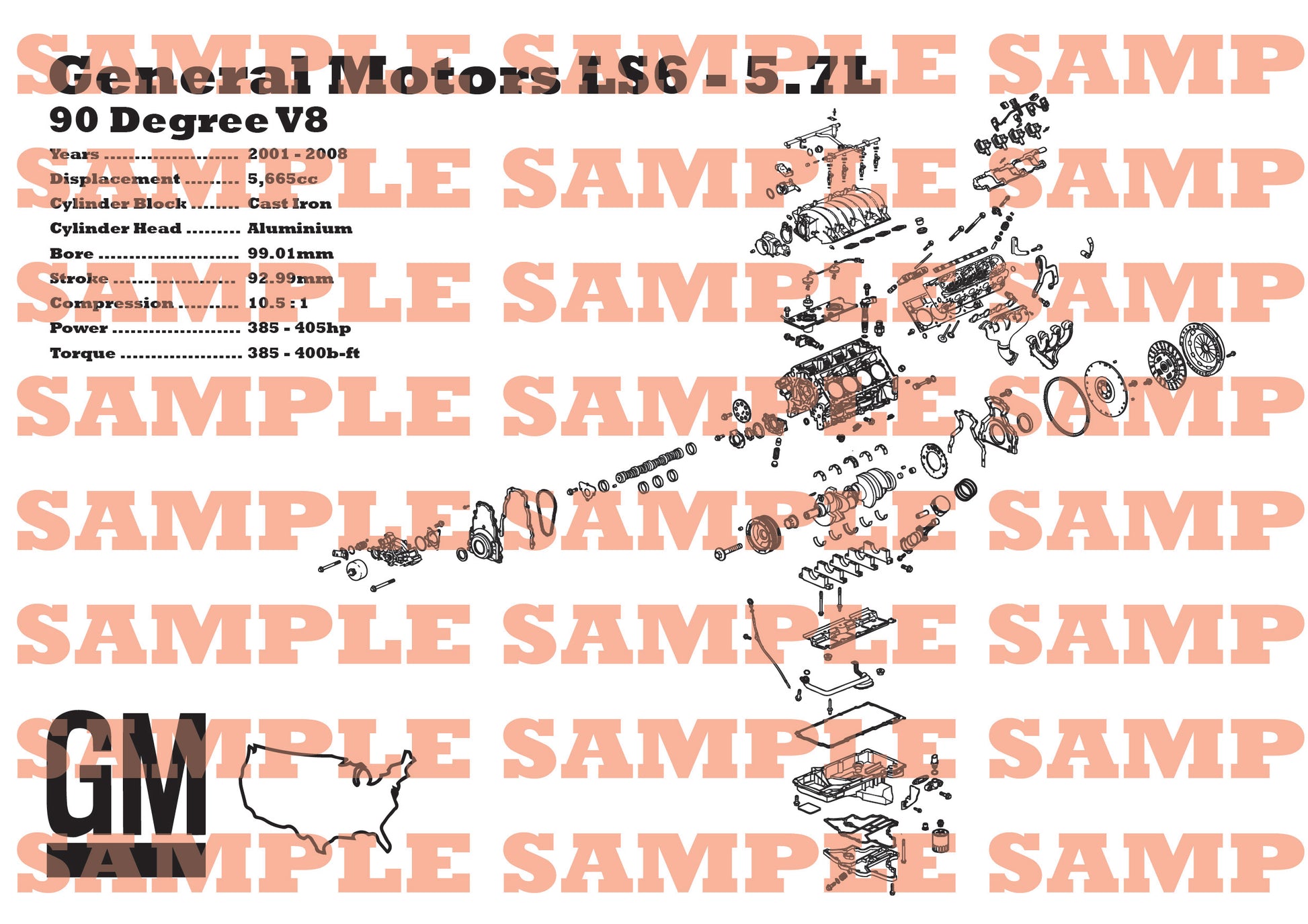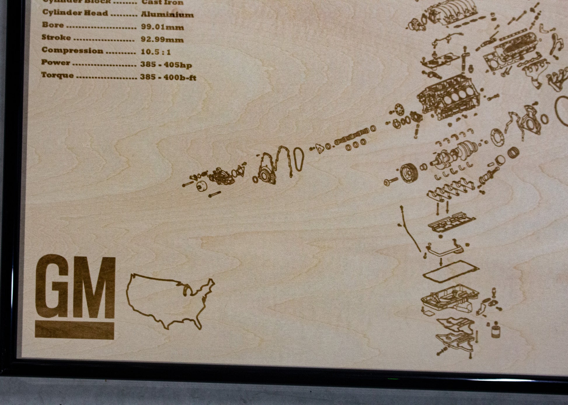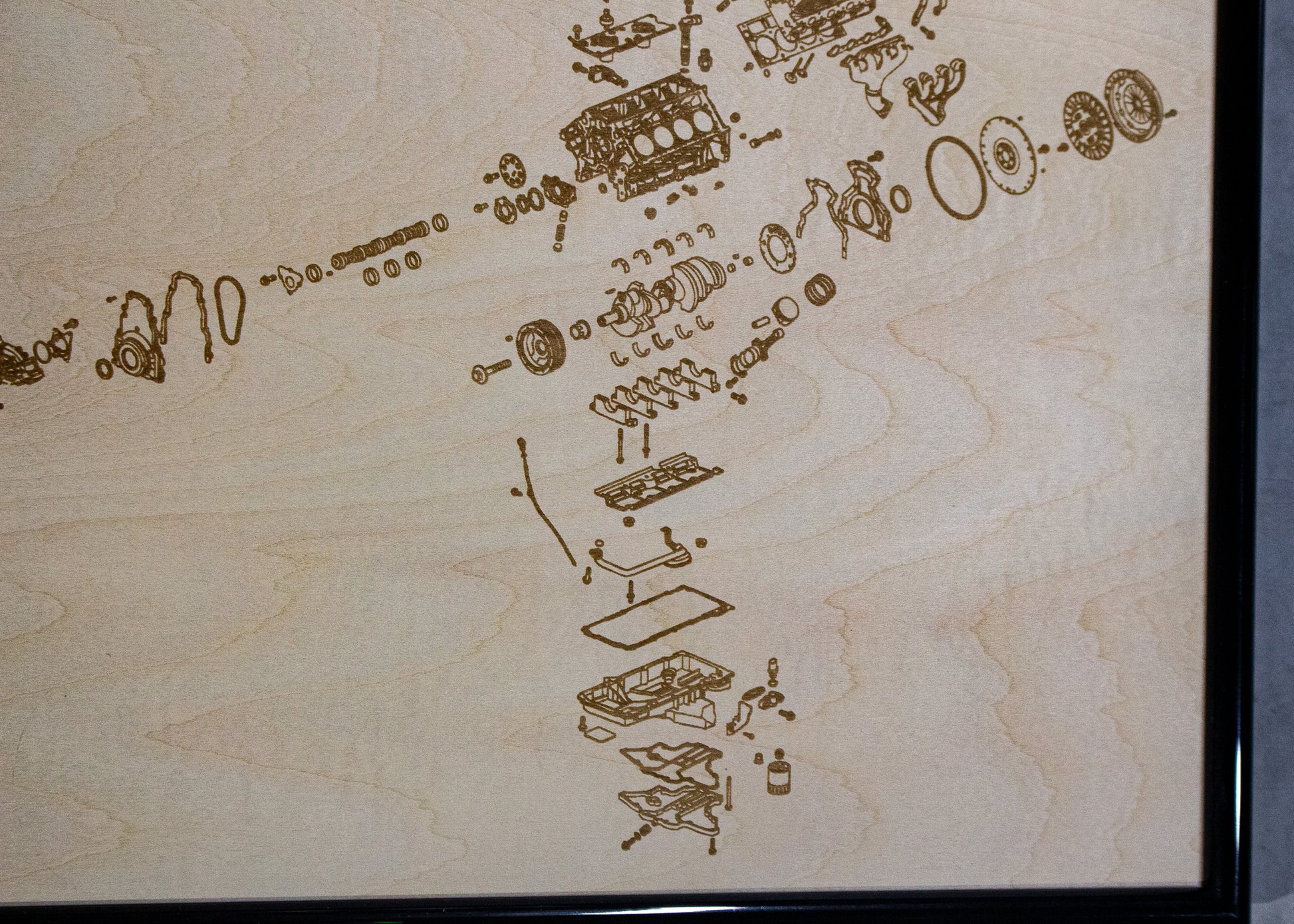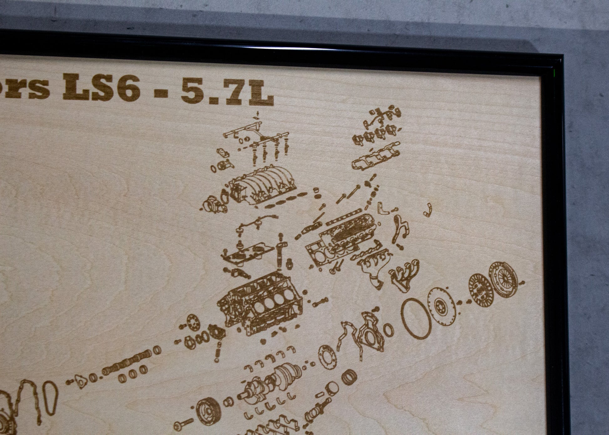 Laser engraved exploded view of General Motor's Iconic LS6 V8 Engine. Wrapped in a sturdy frame with solid mounting points. Each poster is hand made and laser engraved right here in Adelaide.