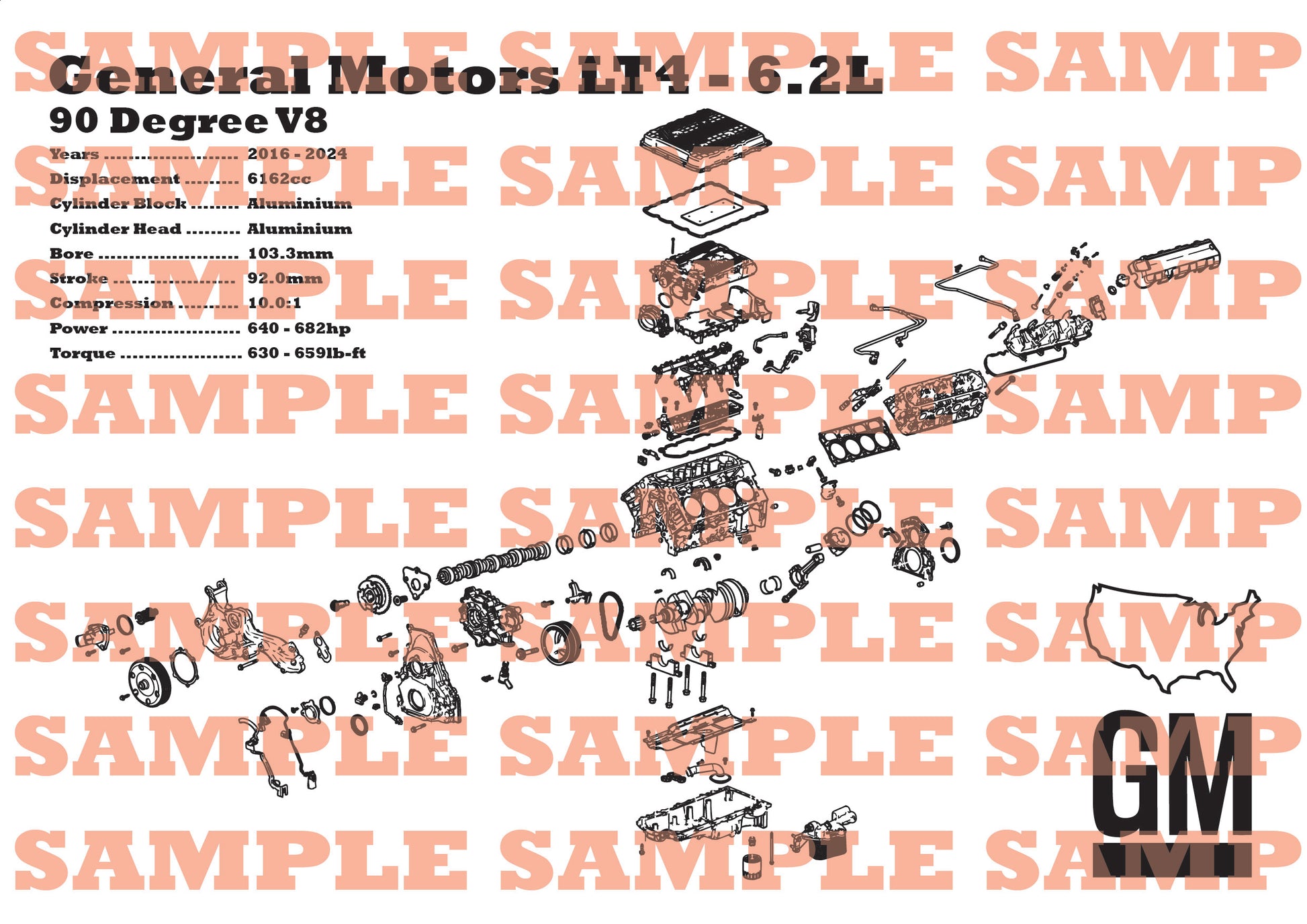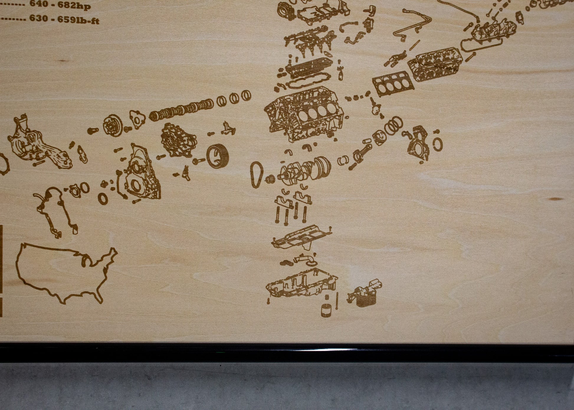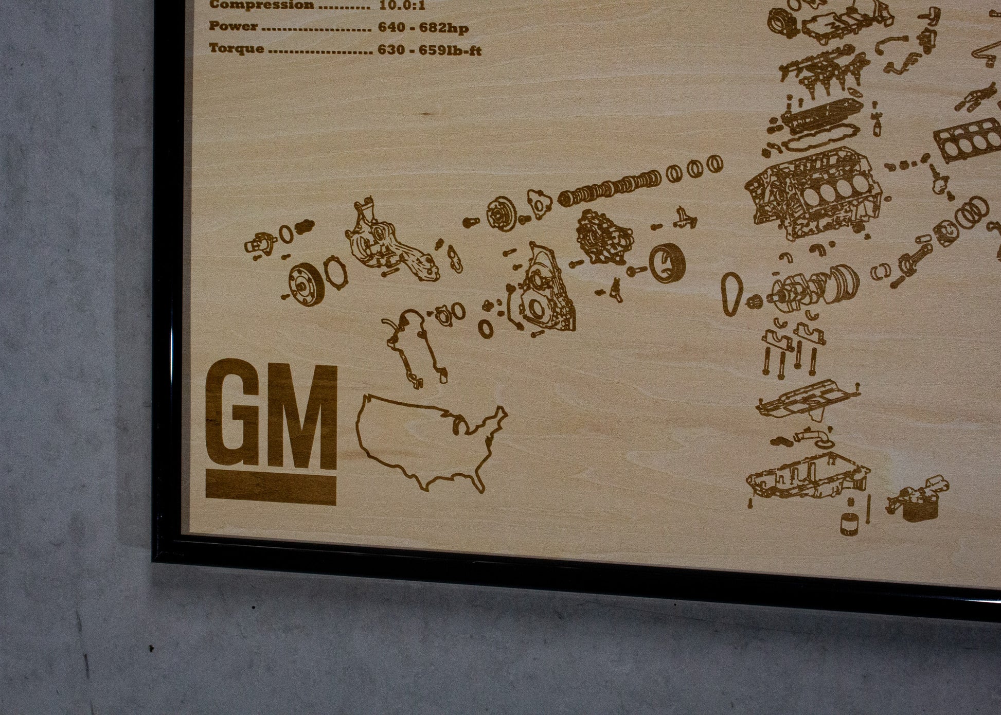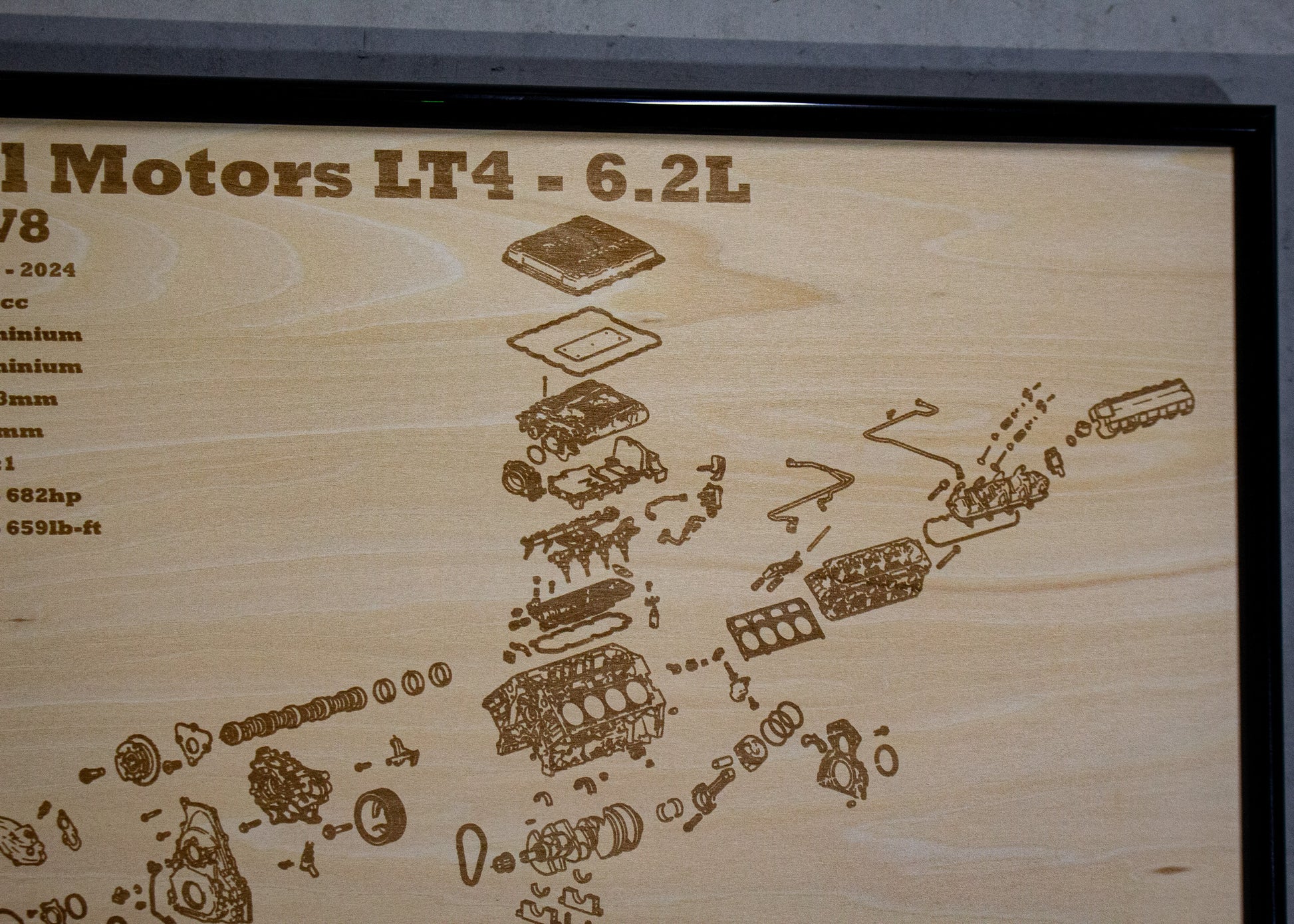 Laser engraved exploded view of General Motor's Iconic LT4 V8 Engine. Wrapped in a sturdy frame with solid mounting points. Each poster is hand made and laser engraved right here in Adelaide.