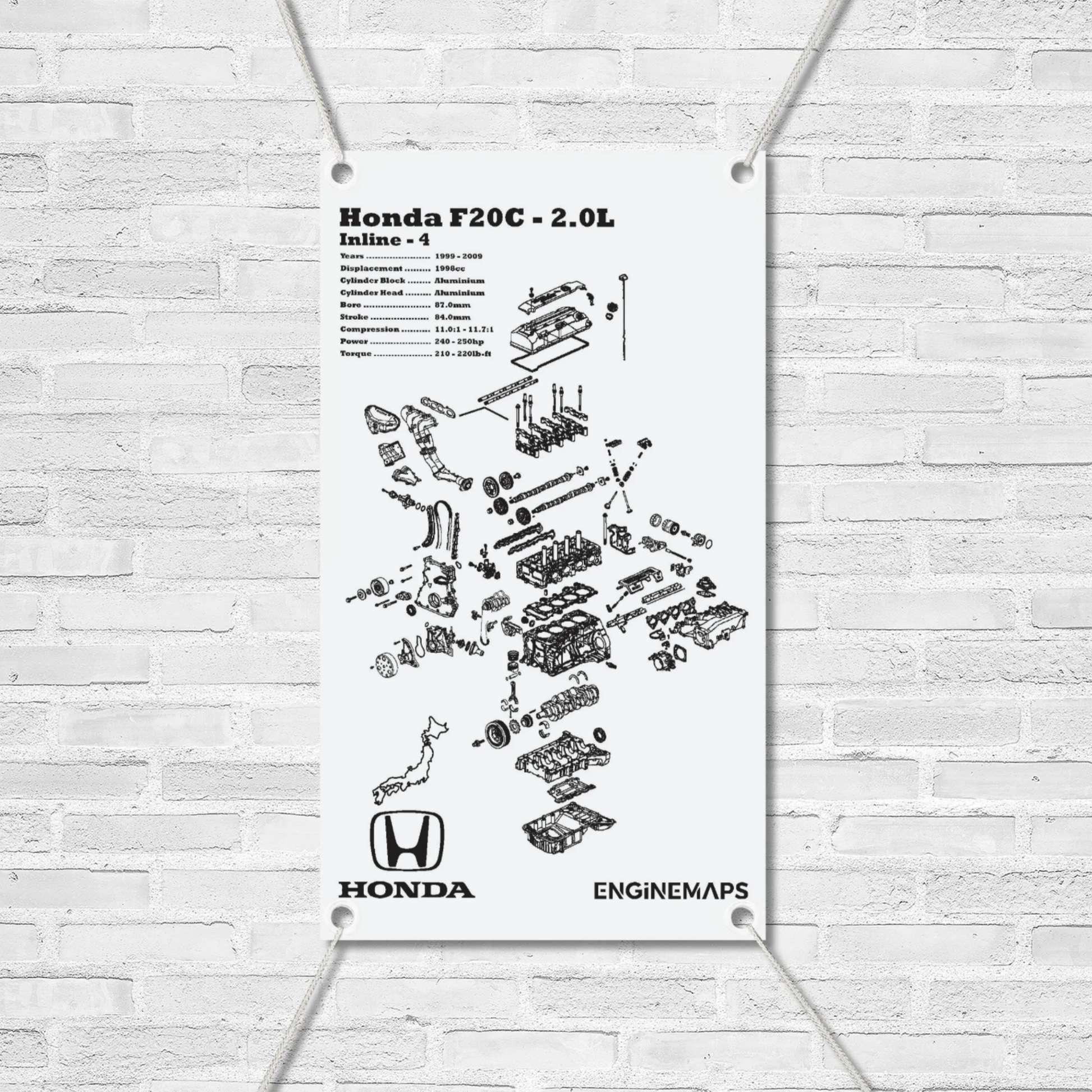 Exploded view banner of Honda's F20C Engine. Made with durable external grade vinyl with reinforced hems. 3 sizes available, perfect for everything from wall decor to hanging in the shed / garage / workshop. Strong Eyelets come standard.