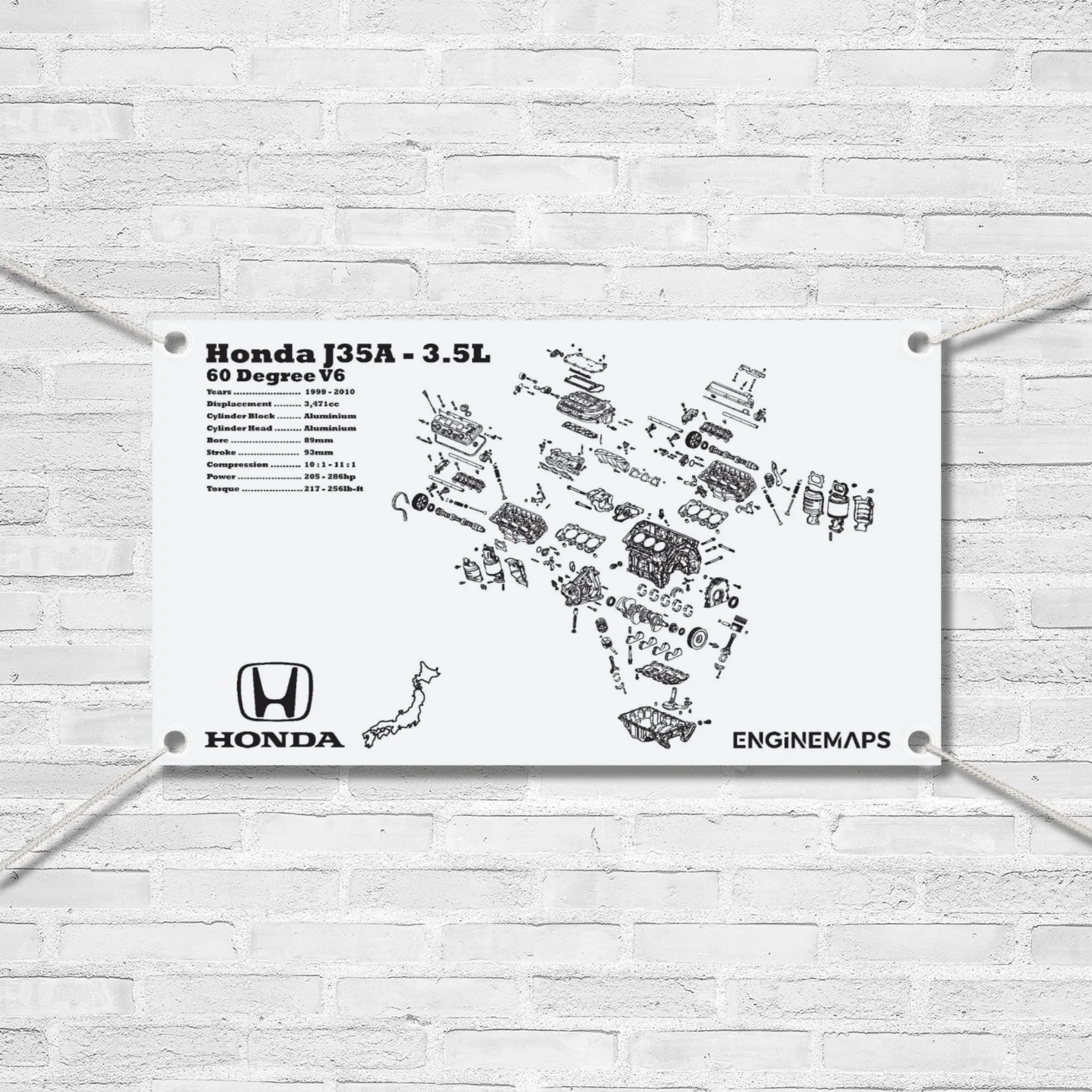 Exploded view banner of Honda's Iconic J35A Engine. Made with durable external grade vinyl with reinforced hems. 3 sizes available, perfect for everything from wall decor to hanging in the shed / garage / workshop. Strong Eyelets come standard.