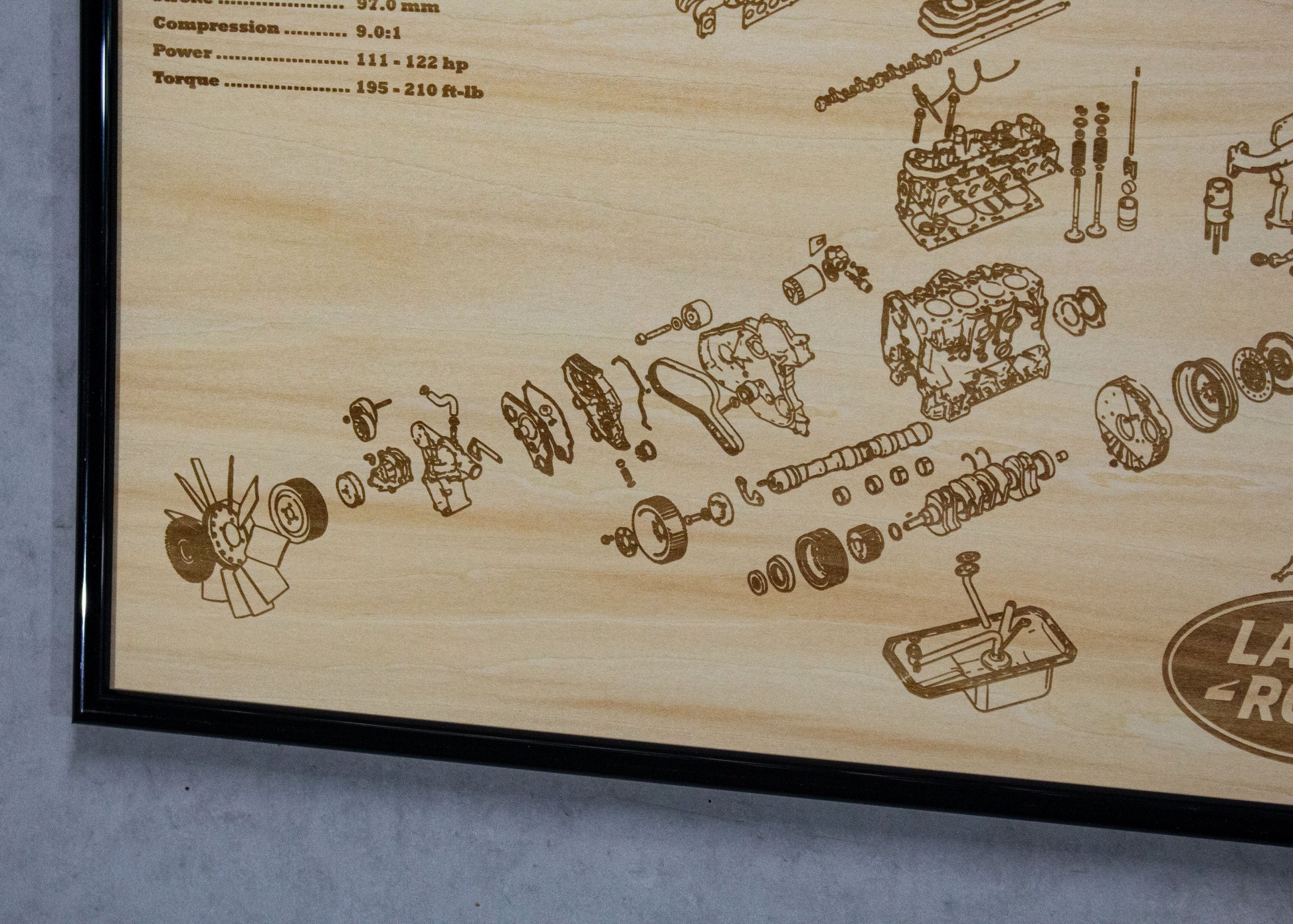 Laser engraved exploded view of Land Rover's Iconic 300TDi Engine. Wrapped in a sturdy frame with solid mounting points. Each poster is hand made and laser engraved right here in Adelaide.