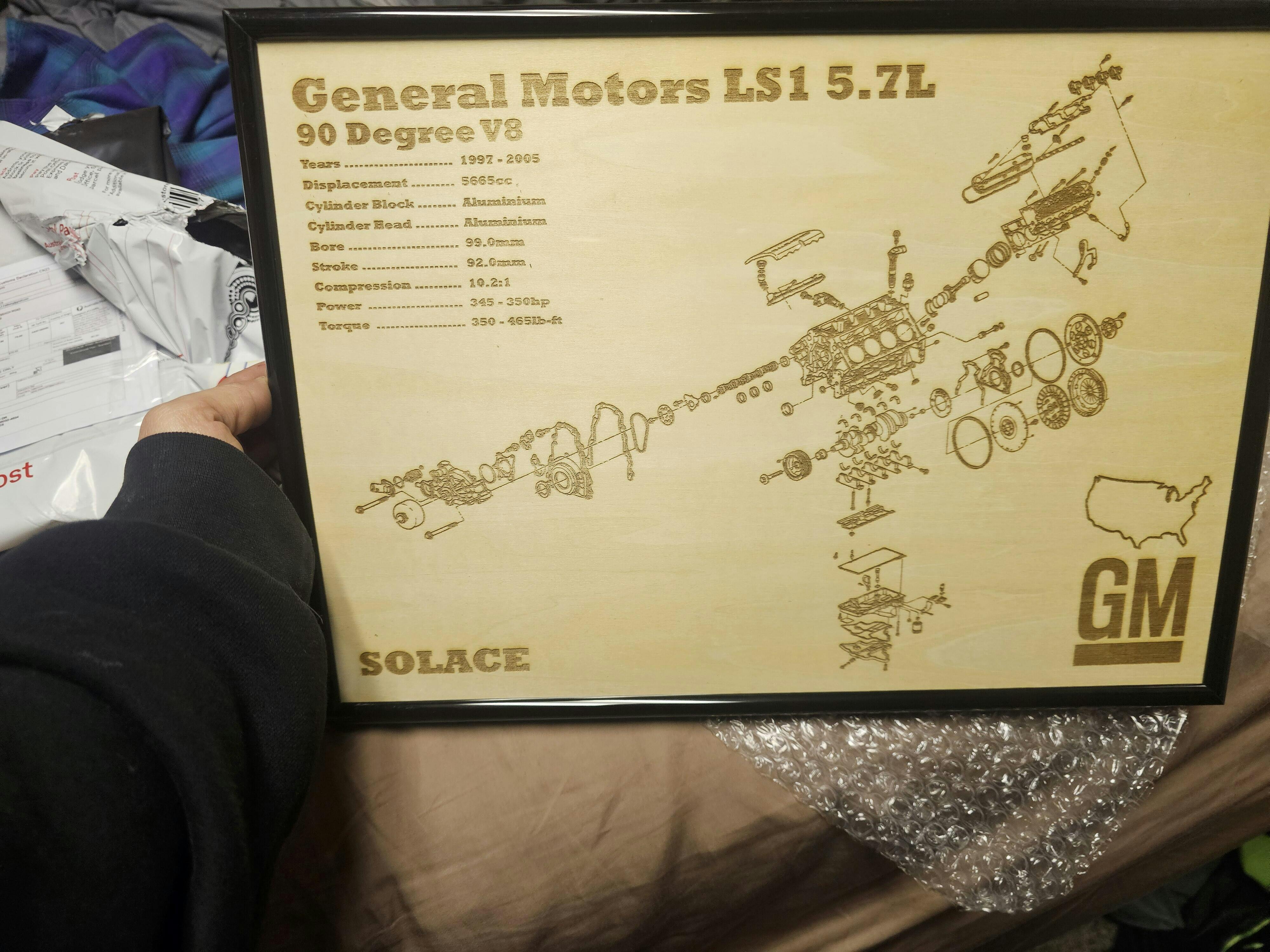 Laser engraved exploded view of General Motors' Iconic LS1 Engine. Wrapped in a sturdy frame with solid mounting points. Each poster is hand made and laser engraved right here in Adelaide.