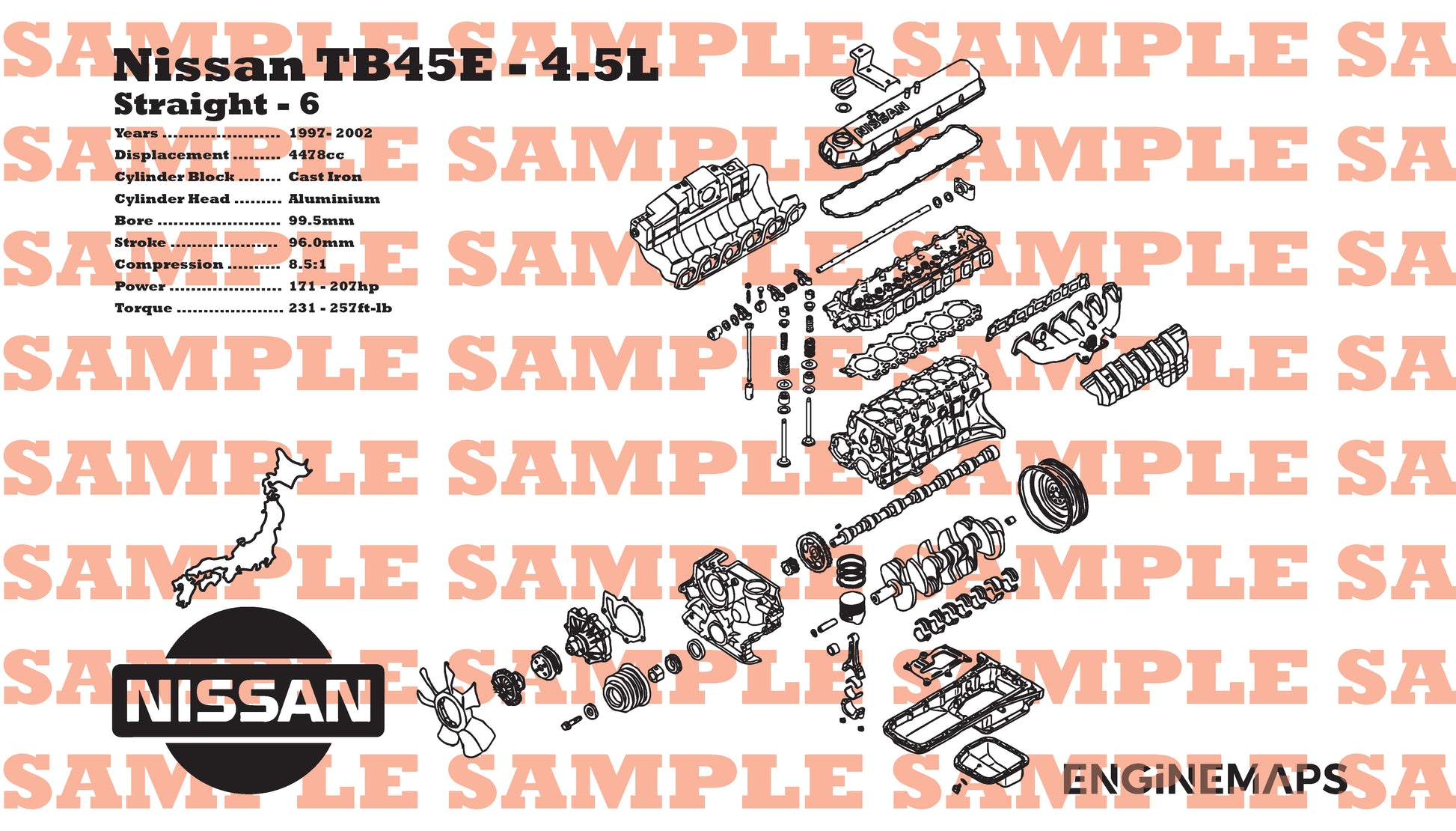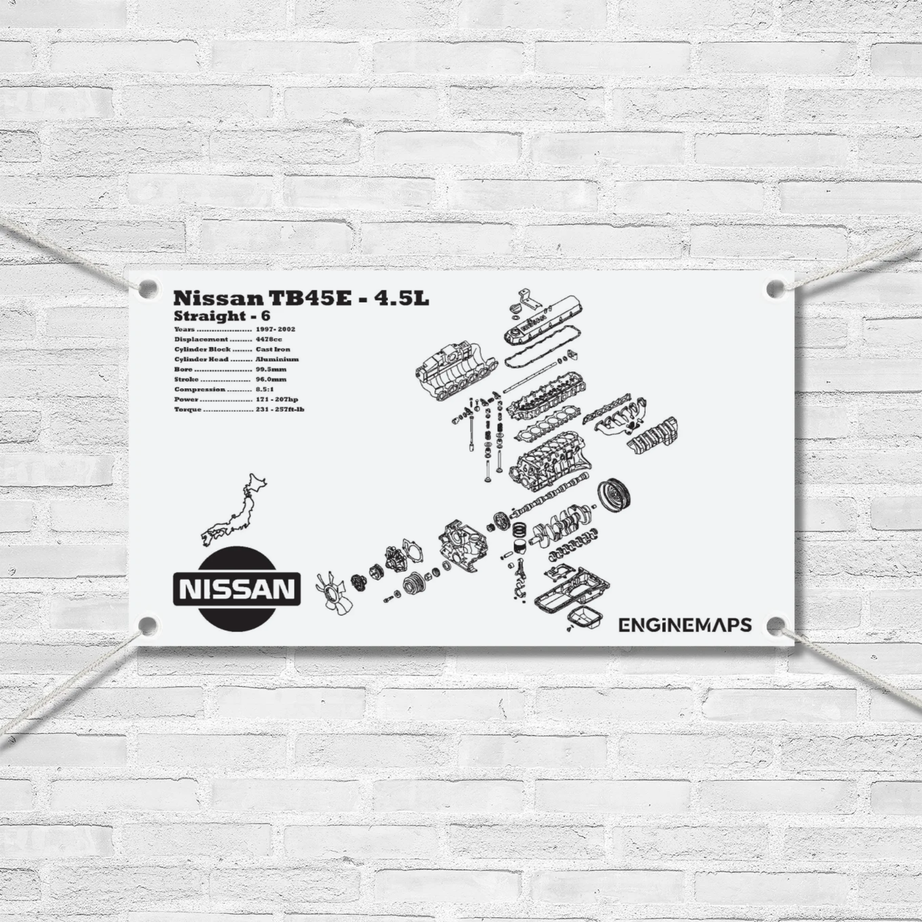 Exploded view banner of Nissan's Iconic TB45E Engine. Made with durable external grade vinyl with reinforced hems. 3 sizes available, perfect for everything from wall decor to hanging in the shed / garage / workshop. Strong Eyelets come standard.