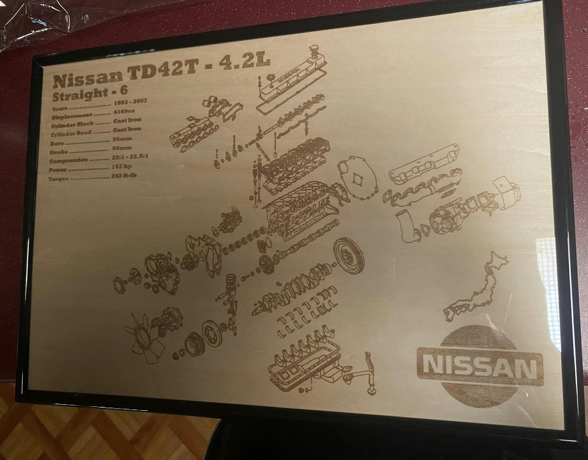 Laser engraved exploded view of Nissan's Iconic TD42T Engine. Wrapped in a sturdy frame with solid mounting points. Each poster is hand made and laser engraved right here in Adelaide.