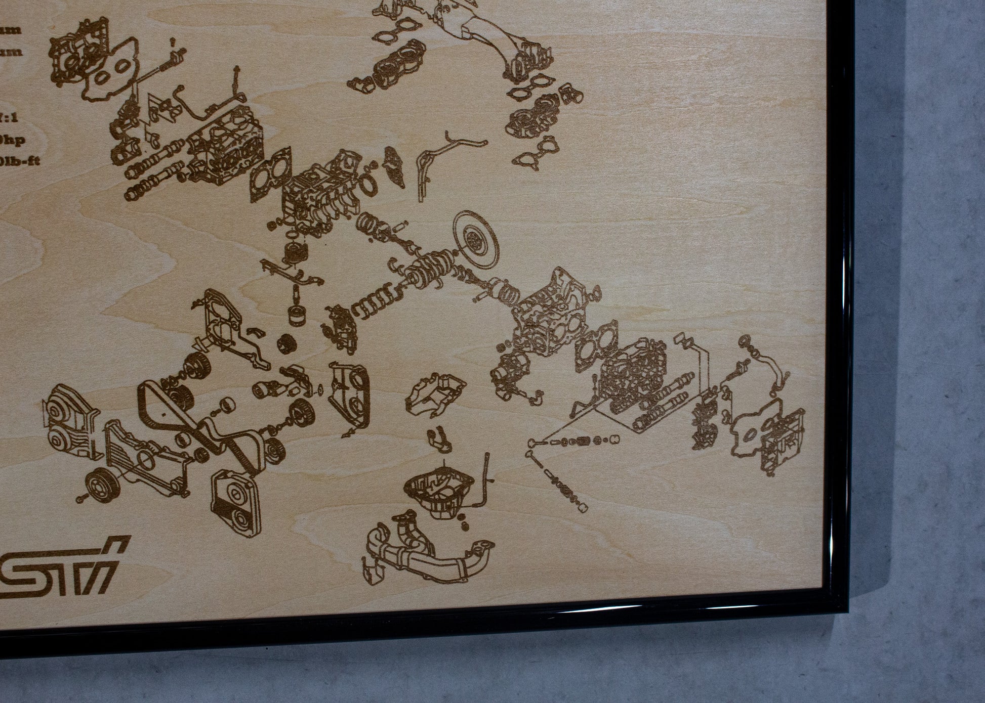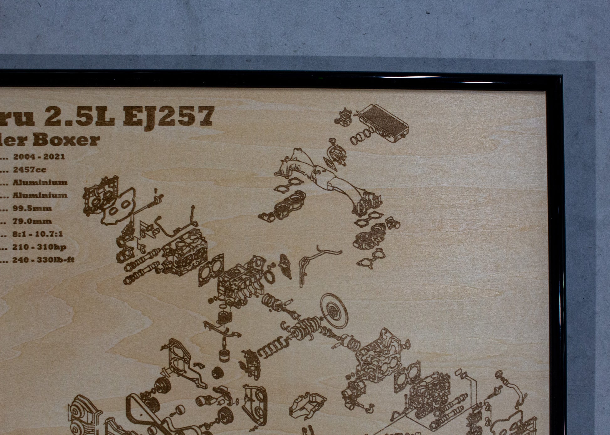 Laser engraved exploded view of Subaru's Iconic EJ257 Engine. Wrapped in a sturdy frame with solid mounting points. Each poster is hand made and laser engraved right here in Adelaide.