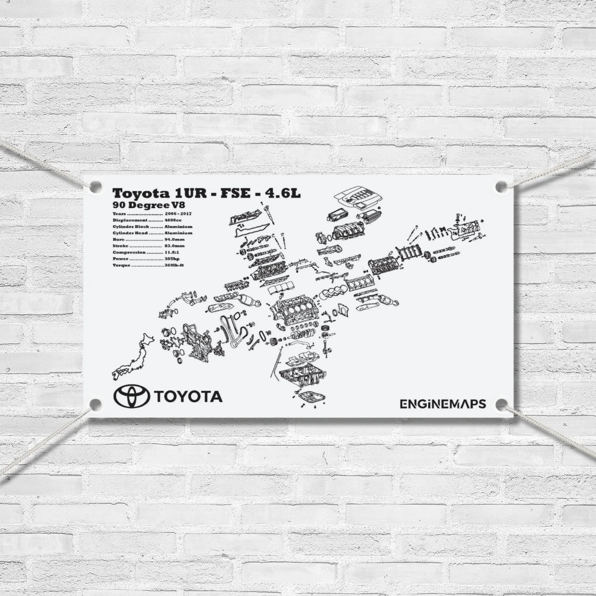Exploded view banner of Toyotas Iconic 1UR-FSE Engine. Made with durable external grade vinyl with reinforced hems. 3 sizes available, perfect for everything from wall decor to hanging in the shed / garage / workshop. Strong Eyelets come standard.