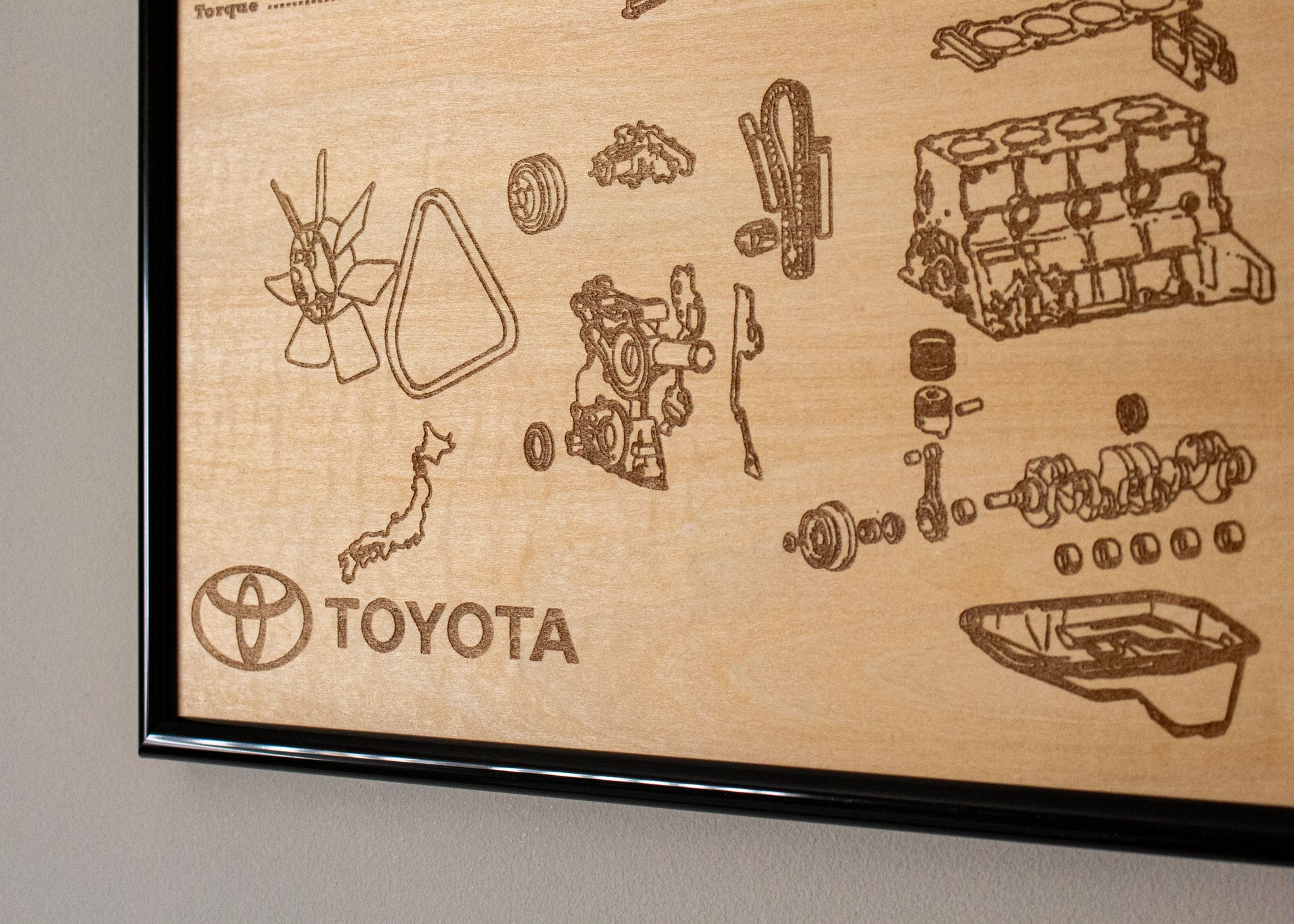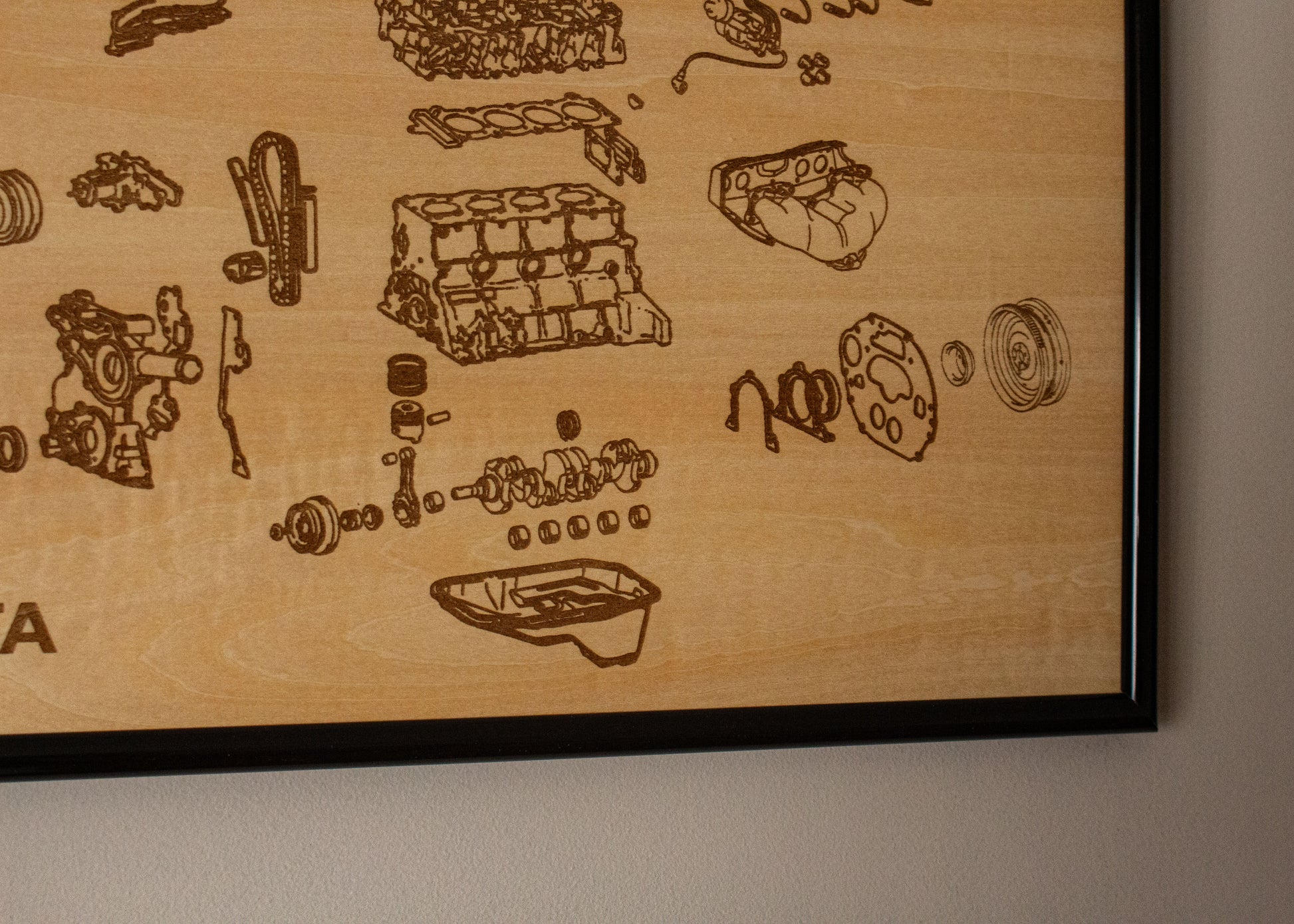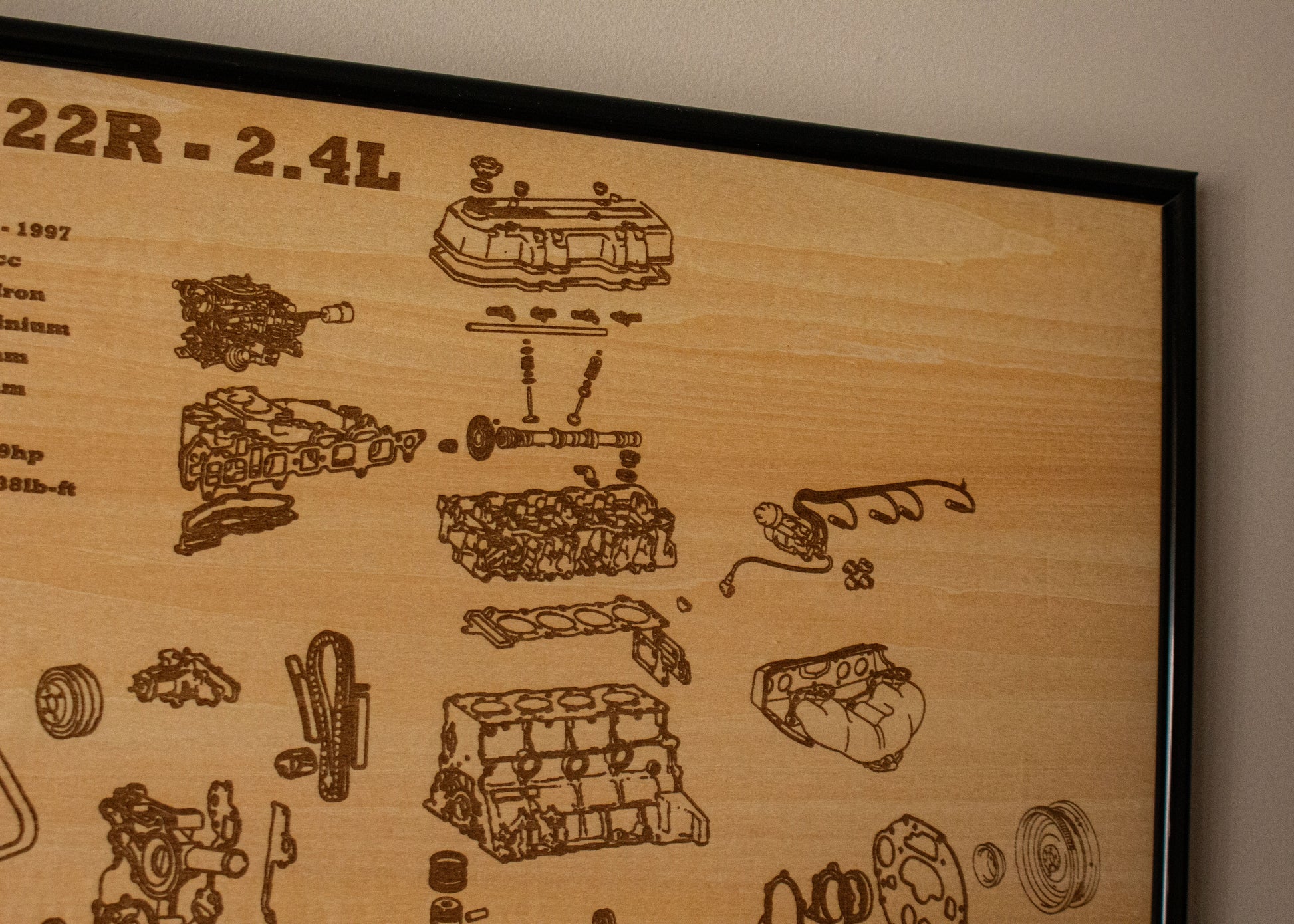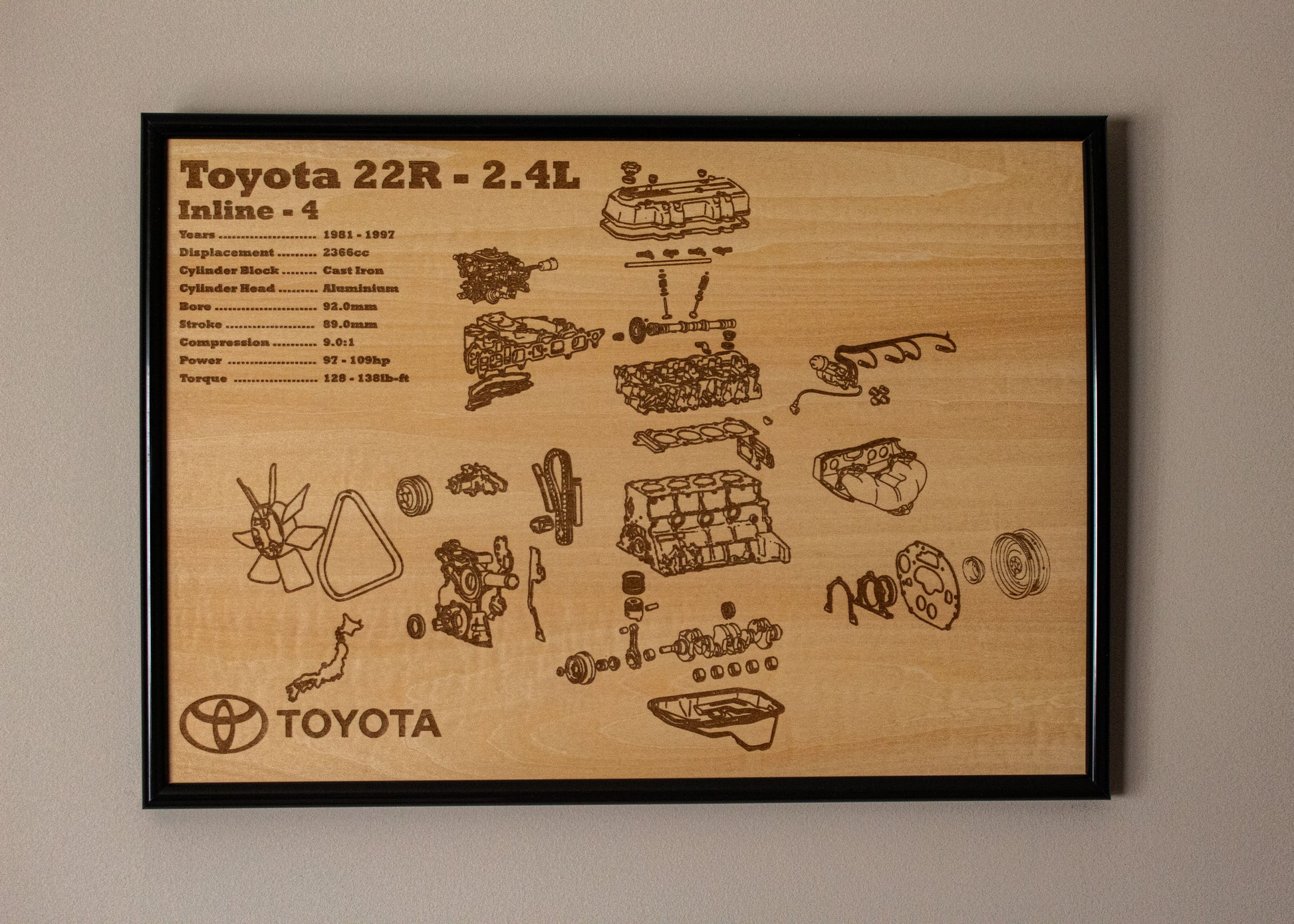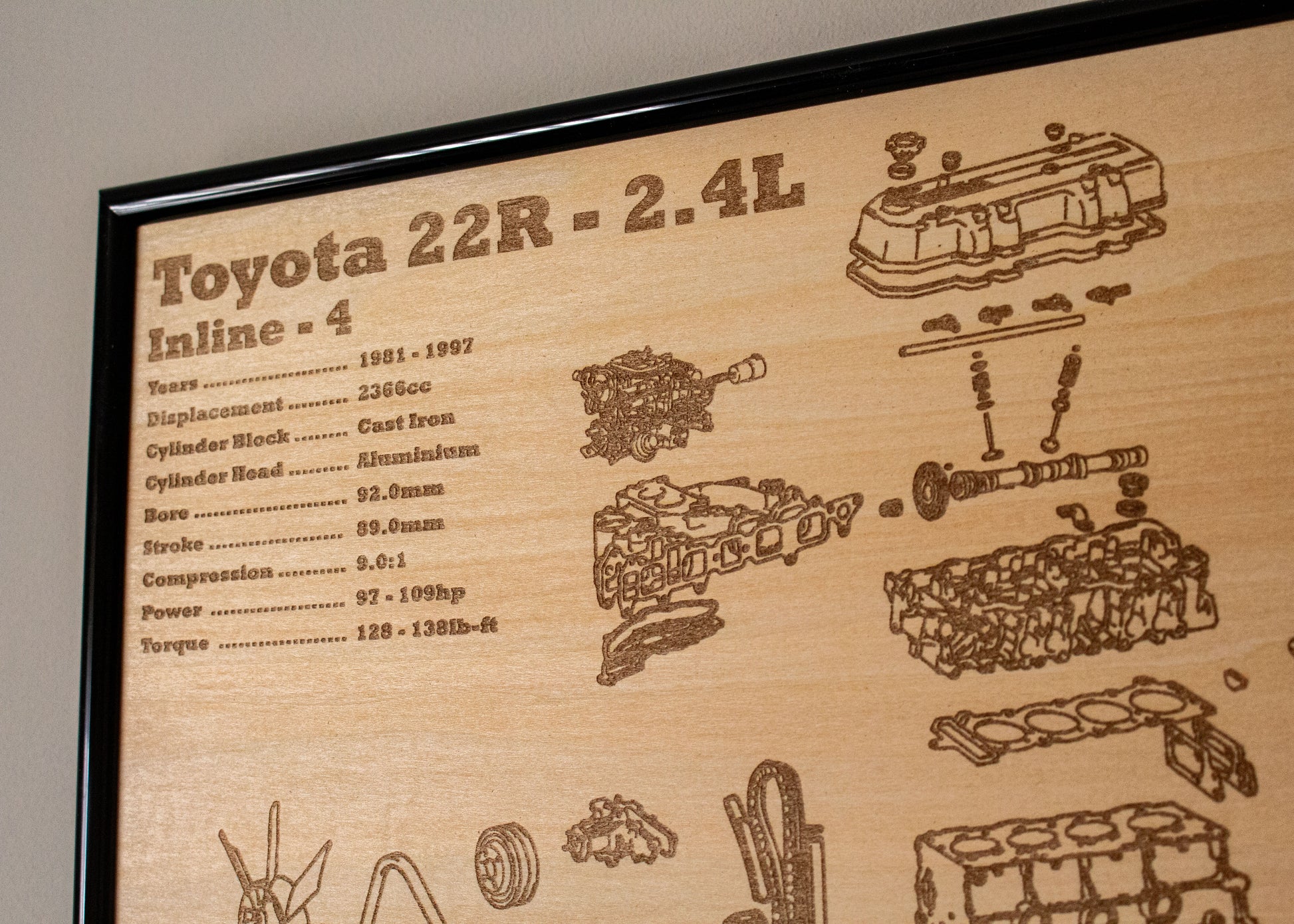 Laser engraved exploded view of Toyotas Iconic 22R Engine. Wrapped in a sturdy frame with solid mounting points. Each poster is hand made and laser engraved right here in Adelaide.