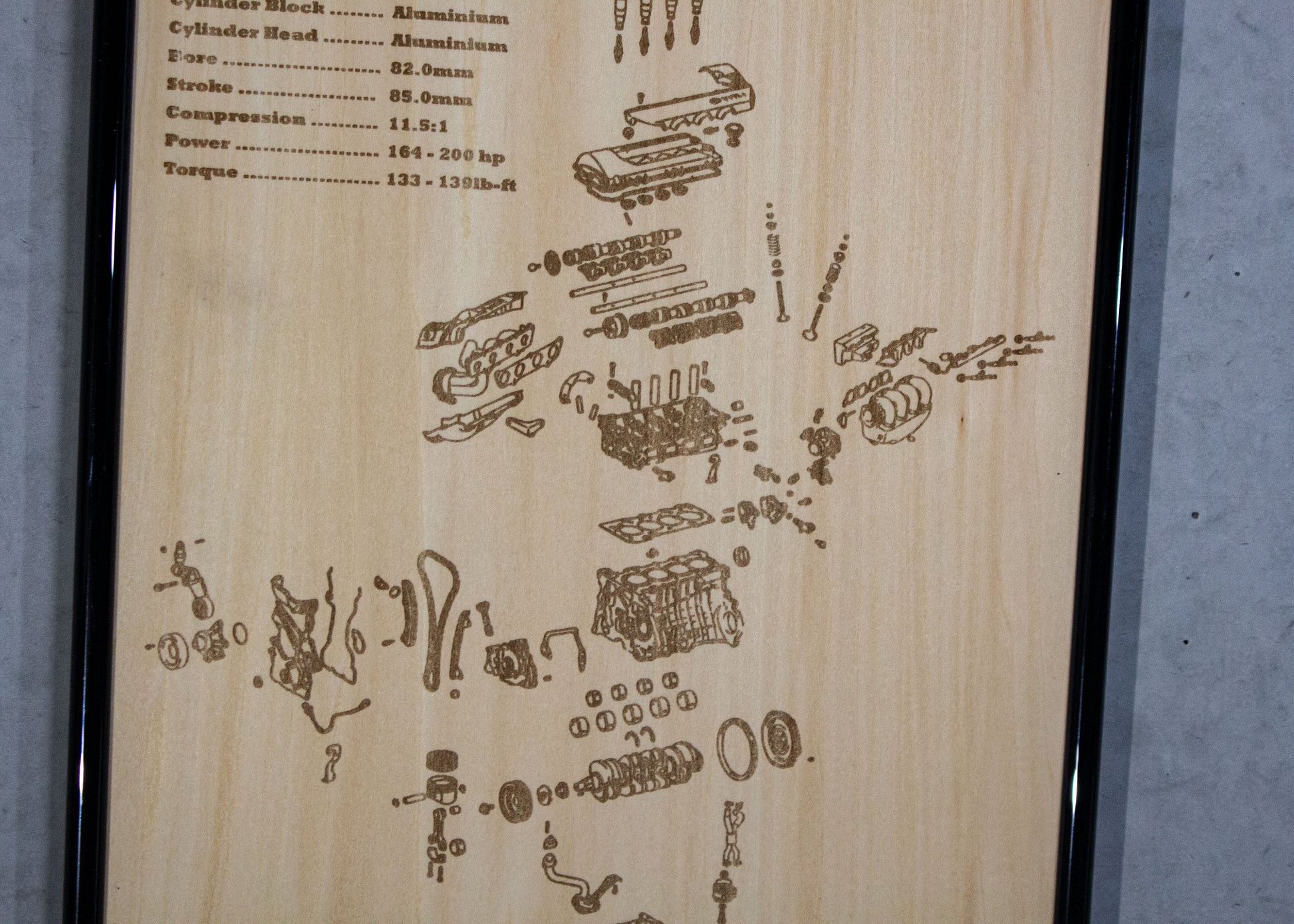 Laser engraved exploded view of Toyotas Iconic 2ZZ-GE Engine. Wrapped in a sturdy frame with solid mounting points. Each poster is hand made and laser engraved right here in Adelaide.