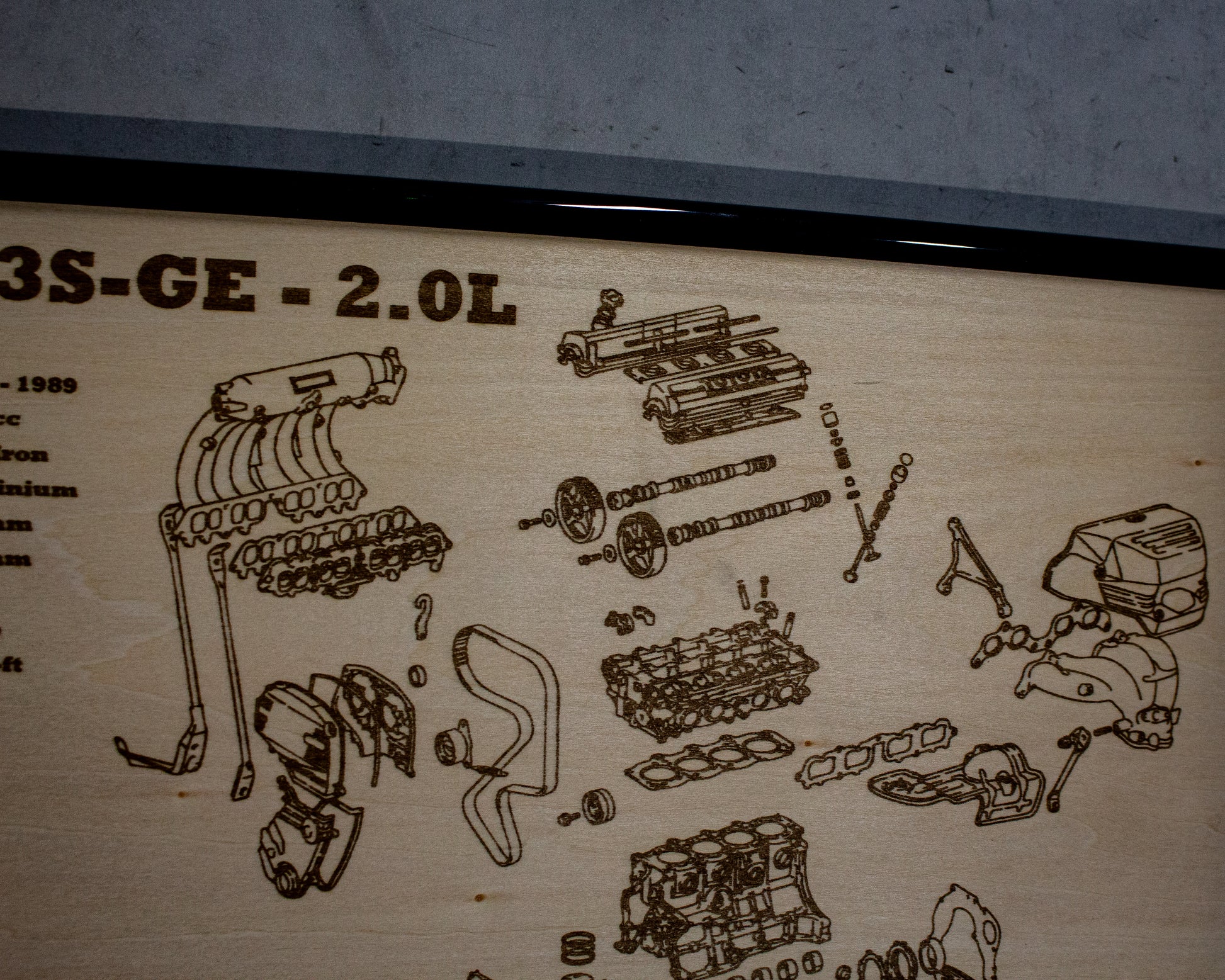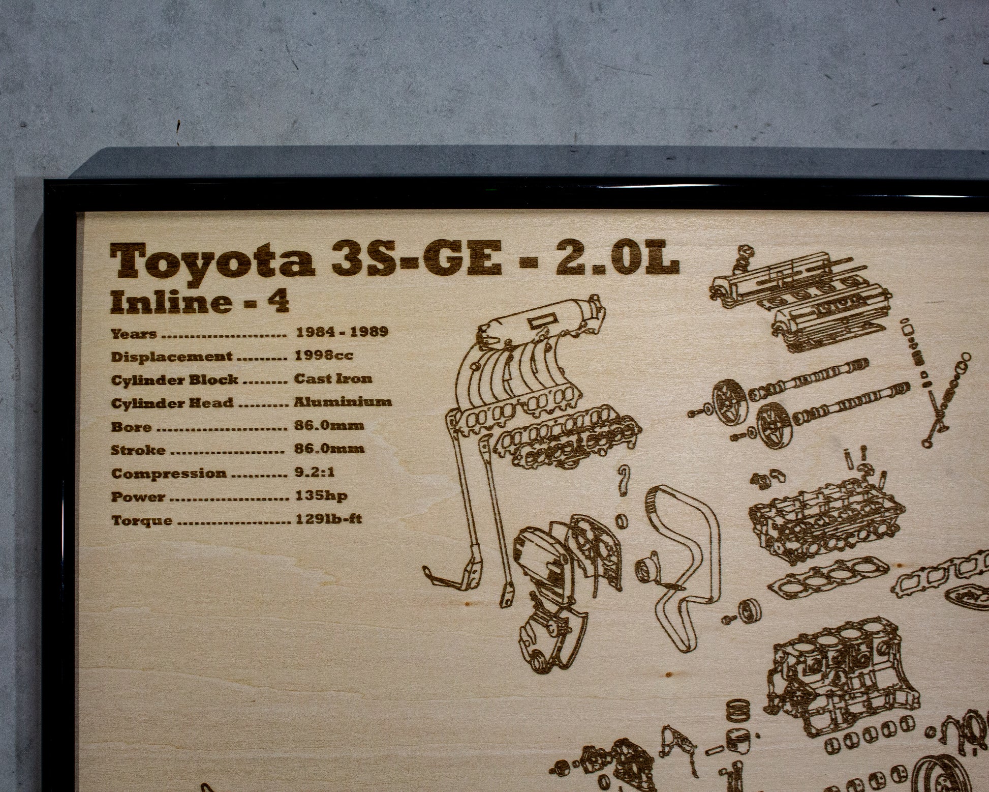 Laser engraved exploded view of Toyotas Iconic 1st gen 3S-GE Engine. Wrapped in a sturdy frame with solid mounting points. Each poster is hand made and laser engraved right here in Adelaide.
