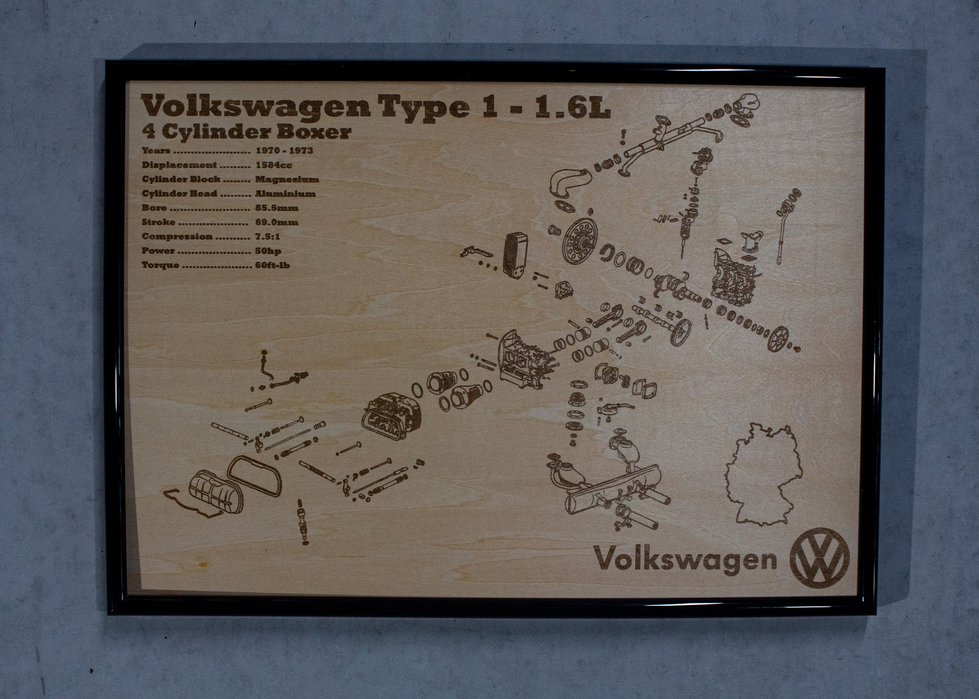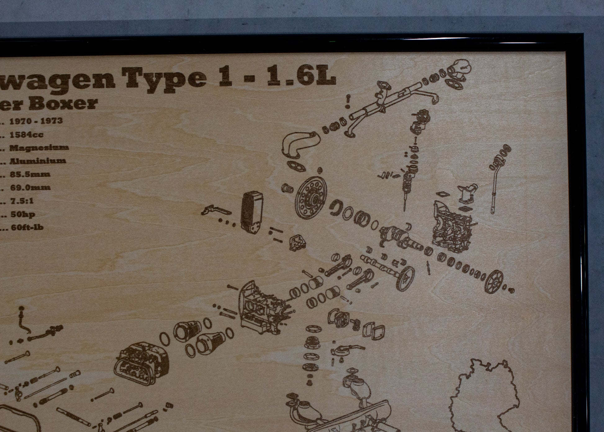 Laser engraved exploded view of Volkswagens Iconic Type 1 1600cc 50hp Engine. Wrapped in a sturdy frame with solid mounting points. Each poster is hand made and laser engraved right here in Adelaide.